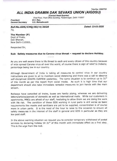 Due to Outbreak of COVID-19, Postponement of conducting melas for IPPB/RPLI and provide sanitizer and essential commodities to BOs -reg.