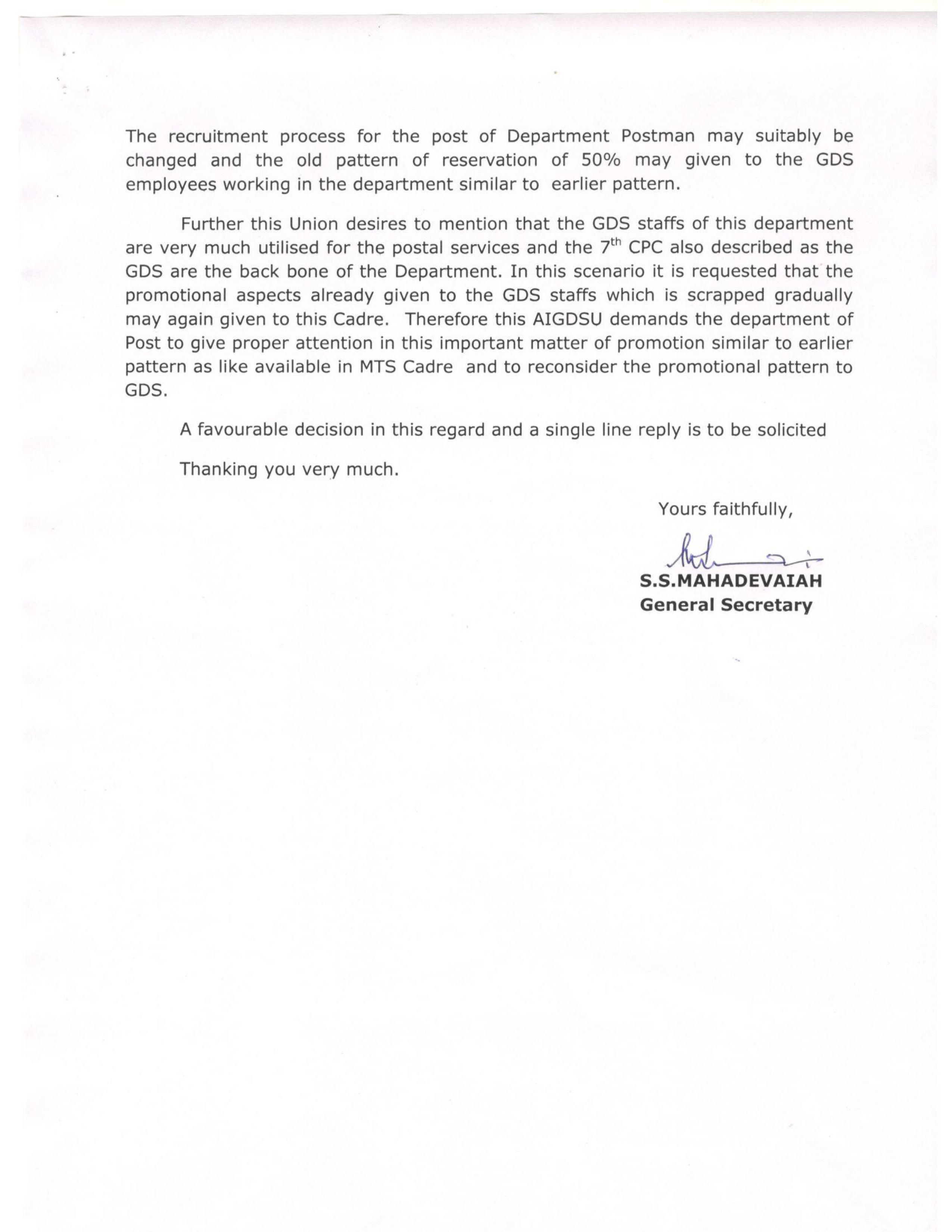 Request to consider promotion for GDS under seniority to the cadre of Post man in the department of Post regarding.