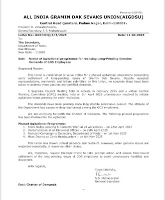 AIGDSU Letter to DoP on - Notice of Agitational programme for realising Long-Pending Genuine Demands of GDS Employees.